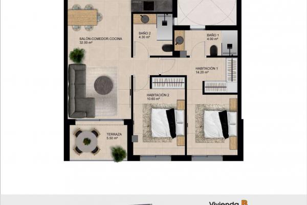 A well-proportioned first-floor apartment with 84.75 m² of built area, offering 2 bedrooms and 2 bathrooms. Priced at 207,000€, with completion expected in May 2027, it’s a perfect option for both full-time living or a lock-up-and-leave holiday home.
