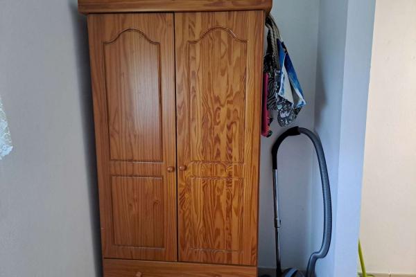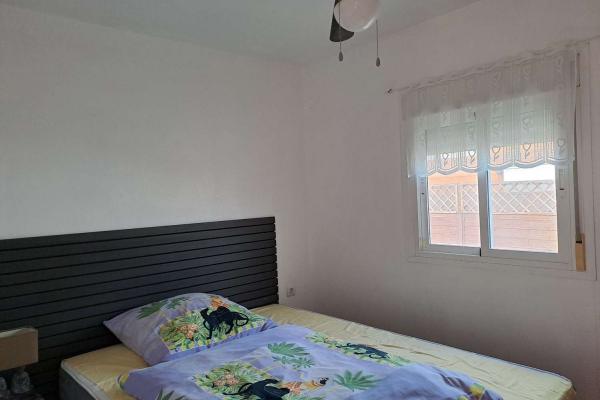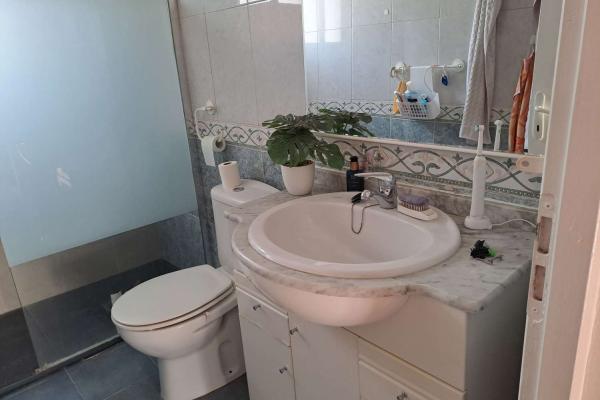 The bathroom has a large walk in shower, and the master bedroom has a double bed and the 2nd bedroom has a single bed, but there is space for another. It is being sold part furnished. please note that the "garden" with flowers and hedges is a picture fastened to the fence. There is no garden.