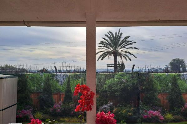 Covered porch area, with countryside views, ideal for relaxing outdoors.